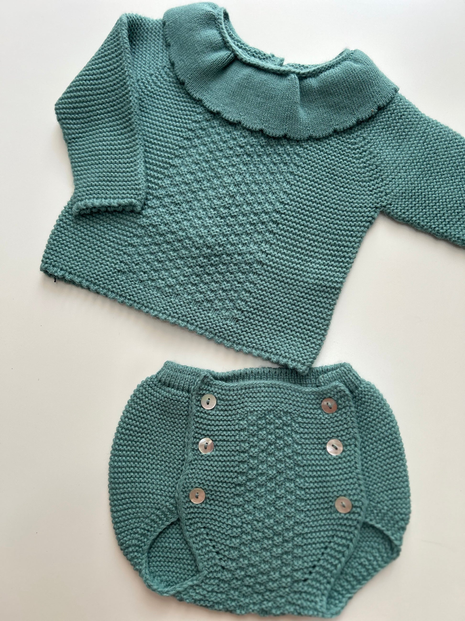 Incluye un jersey de punto con delicados detalles y una braguita a juego, creando un look tierno y elegante a la vez.